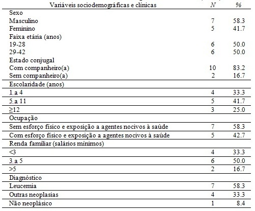 Dos 14 pacientes contactados, 12 aceitaram participar da pesquisa. Todos estavam recém-transplantados, tendo em média 96 dias pós-TMO, com desvio padrão de 2,24. O menor tempo pós-TMO foi 93 dias e o maior 100 dias.
