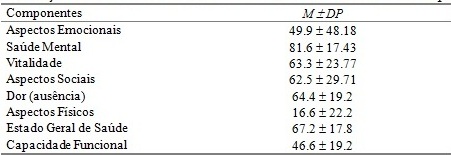 A avaliação da SF-36 seguiu as instruções de Ciconelli et al (1999). Após a aplicação, foi atribuído um escore para cada questão, que, posteriormente, foi transformado em escala de 0 a 100. Quanto mais próximo do escore 100, mais preservado encontra-se aquele domínio. Portanto, cada aspecto é analisado separadamente, não existindo um valor geral.