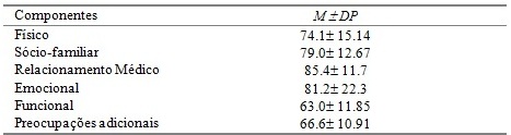 O quadro 3 mostra os resultados obtidos na qualidade de vida, avaliada pela FACT-BMT. A análise dos dados evidenciou uma preservação de todos os aspectos avaliados, com destaque para Relacionamento com o médico, Bem-estar emocional e Bem-estar social/familiar. O aspecto que encontra com menor preservação é o Bem-estar funcional, que é um componente relativo à capacidade de realizar atividades em casa e relacionadas a lazer, bem como a satisfação com a condição de vida atual.