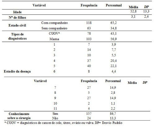 Descrição das participantes (N=181) em relação características sóciodemográficas, clínicas e quanto ao conhecimento da cirurgia.