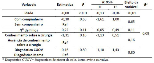 A média de idade das mulheres que se submeteram à cirurgia para retirada de tumor maligno foi de 52,8 anos, nesta amostra. A American Cancer Society (2011) destaca que as mulheres que foram diagnosticadas com câncer de mama, no período de 2004 a 2008, nos Estados Unidos, tinham uma média de idade de 61 anos ou menos. A literatura relata que o câncer de colo de útero está fortemente relacionado à presença de infecção, por doenças sexualmente transmissíveis, especialmente pelo Papilomavirus (Derchain, Logatto Filho & Syrjanen, 2005; Guerra, Gallo & Mendonça, 2005; INCA 2012; Medeiros, Medeiros, Moraes, Menezes-Filho, Ramos & Saturnino, 2005) e acomete principalmente mulheres jovens, com idades entre 35 e 39 anos (INCA, 2012; Trent Cancer Registry & National Cancer Intelligence Network´s, 2011).