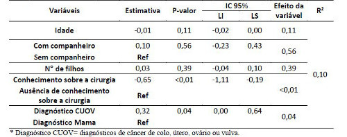 Em relação ao diagnóstico de neoplasia, 56,9% das participantes apresentavam diagnóstico de câncer de mama e 13,3% das pacientes referiram não ter informações sobre a cirurgia a que iriam se submeter (Quadro 1).