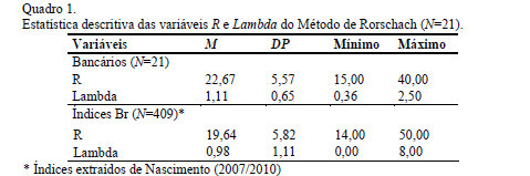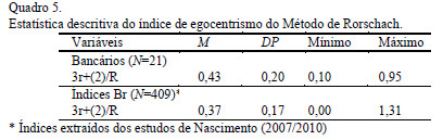 No que se refere ao Método de Rorschach, analisando os resultados obtidos quanto ao número de respostas (R), com o estudo normativo (Nascimento, 2010), considera-se um número médio de respostas um valor entre 16 e 22 e indivíduos com maior escolaridade e nível socioeconômico, tendem a dar mais respostas. Conforme Quadro 4 observa-se valor maior nos bancários. Tal resultado pode ser decorrente da maior escolaridade deste grupo, visto que a maioria tem mais de 12 anos de escolaridade, enquanto nem a metade dos avaliados no estudo normativo apresentou o mesmo tempo de estudo. Entende-se, portanto, que o nível de escolaridade da amostra pesquisada, assim como o fato de que a maioria pertence à classe A (57,14%), pode ter influenciado este resultado.