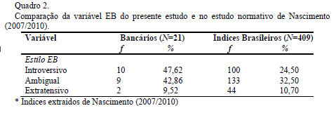 Sendo o conteúdo humano inteiro (H) uma variável referente ao Relacionamento Interpessoal analisada para pontuar o CDI, cabe mencionar que este índice foi maior nos bancários estudados, conforme Quadro 4. Weiner (2000) salienta que esta variável serve como indicativa do nível de interesse do sujeito nas outras pessoas e, portanto, pode-se pensar que a amostra deste estudo possui um bom nível de interesse nas outras pessoas. É uma variável que está relacionada ao tipo de vivência (EB) e, de acordo com Exner Jr. e Sendín (1999), sujeitos introversivos tendem a apresentar mais respostas de conteúdo humano que os extratensivos. Visto que a maioria dos integrantes da amostra utiliza um estilo (EB) introversivo (47,62%), o resultado encontrado nessa amostra está de acordo com o esperado.