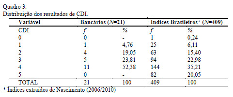 De maneira geral, as variáveis que compõem o índice CDI, que correspondem ao Controle do Estresse, indicam que os bancários encontravam-se, no momento da avaliação, sobrecarregados psiquicamente e com dificuldade crônica para lidar com o estresse. Parece faltar-lhes maturidade psíquica para lidar com situações estressoras.