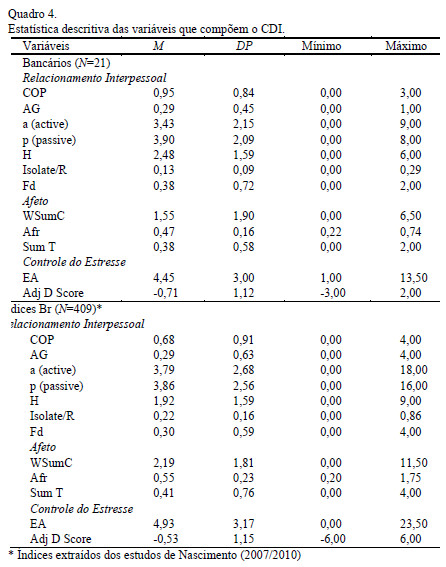 Considerando as variáveis analisadas neste estudo, isto é, aquelas inclusas na constelação do CDI que correspondem a Relacionamento Interpessoal (COP; AG; a:p; H; Isolate/R; Food), Afeto (WSumC; Afr; SumT) e Controle do Estresse (EA e AdjD), os entrevistados apresentaram os resultados mostrados no Quadro 4. Cabe lembrar que a comparação destes resultados com os do estudo normativo brasileiro faz-se importante porque leva em consideração a cultura em que o indivíduo está inserido e, conforme Resende e Argimon (2010), “despatologizam” aquelas variáveis que não são frequentes no estudo normativo de outros países.