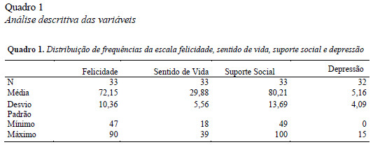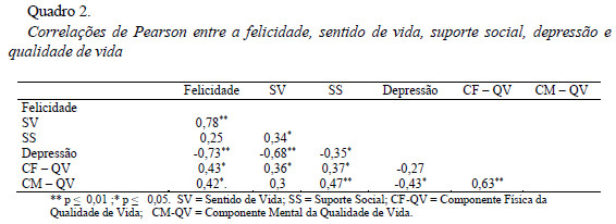 A felicidade apresenta uma correlação positiva forte com o sentido de vida e uma correlação positiva moderada com o CF e CM da QV. Também se encontra uma correlação negativa forte com a depressão. Ou seja, quanto maior a felicidade, menor o grau de depressão e maior o sentido de vida e a adaptação.