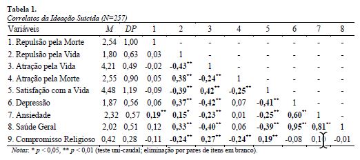 Quanto à relação entre ideação suicida e religiosidade, foi observado que o compromisso religioso se correlacionou positivamente com o fator atração pela vida e negativamente com os fatores repulsão pela vida e atração pela morte. Uma vez que, de um modo geral, pessoas com maior envolvimento religioso, sem levar em consideração a filiação religiosa, possuem menores chances de desenvolver o comportamento suicida, os resultados aqui apresentados corroboram outros achados encontrados em pesquisas realizadas em outros países (Rasic et al., 2011; Osafo, Knizek, Akotia & Hjelmeland, 2013).