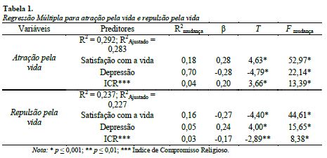 Como pode se observar na tabela 2, a satisfação com a vida (β = 0,28; p ≤ 0,001), a depressão (β = -0,28; p ≤ 0,001) e o compromisso religioso (β = 0,20; p ≤ 0,001) explicaram satisfatoriamente [F (3,236) = 32,46, p ≤ 0,001; R múltiplo = 0,540, R2ajustado = 0,283] a atração pela vida. Tais variáveis, em conjunto, foram responsáveis pela explicação de 29% (R2 = 0,292) da variância total. Cabe destacar que, no modelo testado, a satisfação com a vida, isoladamente, foi responsável por explicar 18,2% (R2 = 0,182) da variância. Quanto à repulsão pela vida, as variáveis satisfação com a vida (β = -0,27; p ≤ 0,001), depressão (β = 0,24; p ≤ 0,001) e compromisso religioso (β = -0,16; p ≤ 0,01) permitiram explicá-la satisfatoriamente [F (3,236) = 24,45, p ≤ 0,001; R múltiplo = 0,487, R2ajustado = 0,227]. Essas contribuíram com 24% (R2 = 0,237) da variância. Nesse caso, a satisfação com a vida, isoladamente, foi responsável por explicar 16% da variância (R2 = 0,158).