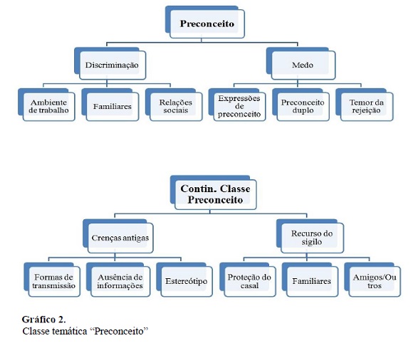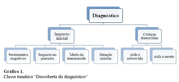 Por meio das entrevistas, emergiram duas classes temáticas, sendo denominadas: Diagnóstico e Preconceito. Na primeira classe temática mencionada, surgiram as categorias Impacto inicial (Subcategorias: Sentimentos negativos, Impacto no parceiro, Medo da transmissão e Ideação Suicida) e Crenças distorcidas (Subcategorias: Aids e sobrevida e Aids e morte). Sobre a classe temática Preconceito, esta trouxe categorias como Discriminação (Subcategorias: Ambiente de trabalho, Familiares e Relações sociais), Medo (Subcategorias: Expressões de preconceito, Preconceito duplo e Temor da rejeição), Crenças antigas (Subcategorias: Formas de transmissão, Ausência de informações e Estereótipo) e Recurso do sigilo (Subcategorias: Proteção do casal, Familiares e Amigos/outros).