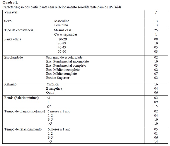 Para compor os dados descritivos, participaram 26 indivíduos com diagnóstico de soropositividade para o HIV/Aids que estavam em relacionamento heterossexual e sorodiferente para o HIV/Aids, no ambulatório onde são acompanhadas para tratamento. Na etapa qualitativa, contou-se com 8 pessoas com diagnóstico positivo para o HIV/Aids e que se encontravam em relacionamento heterossexual e sorodiferente para o HIV/Aids, sendo estas entrevistadas no ambulatório durante o período do estudo.