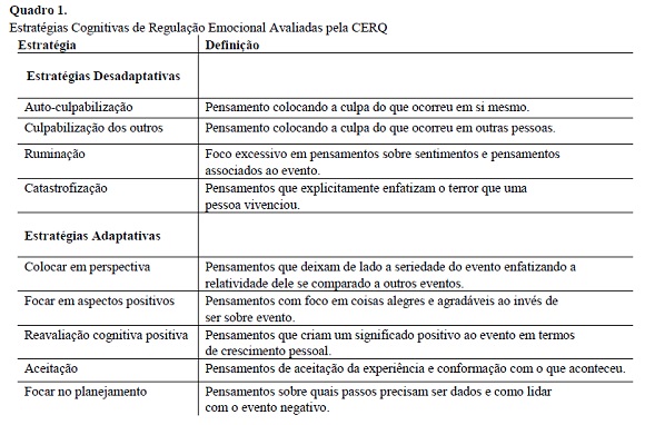 O Cognitive Emotion Regulation Questionnaire (CERQ) consiste em um questionário com nove estratégias cognitivas de regulação emocional: auto-culpabilização, aceitação, ruminação, reorganização positiva, planejamento, reavaliação positiva, colocar em perspectiva, pensamento catastrófico e culpabilização do outro. Através da CERQ, é possível mencionar as estratégias cognitivas de regulação emocional que os indivíduos geralmente usam quando experenciam algo desagradável, classificando-as em adaptativas ou desadaptativas (Quadro 1). Tais estratégias são consideradas adaptativas quando são apropriadas ao contexto e usadas de forma flexível, possibilitando o envolvimento com comportamentos saudáveis, assim como a modulação das respostas emocionais de acordo com a situação. Já as estratégias desadaptativas não alteram a resposta emocional indesejada, gerando prejuízos maiores a longo prazo (OBryan, McLeish., Kraemer, 2015; Schaefer, et al., 2018).