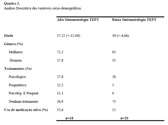 A amostra selecionada consistiu em 38 participantes que passaram por um evento potencialmente traumático, e, a partir disto, há dois grupos distintos, separados pela presença de alta ou baixa sintomatologia para o TEPT. Dos 38 participantes, 20 estudantes são estudantes universitários da PUCRS com baixa sintomatologia de TEPT e 18 são pacientes que buscaram ambulatório de trauma e estresse da PUCRS que possuem alta sintomatologia de TEPT. No Quadro 2 apresenta os dados demográficos específicos de ambos os grupos, com e sem sintomatologia de TEPT. A comparação foi realizada através de análise descritiva das variáveis.