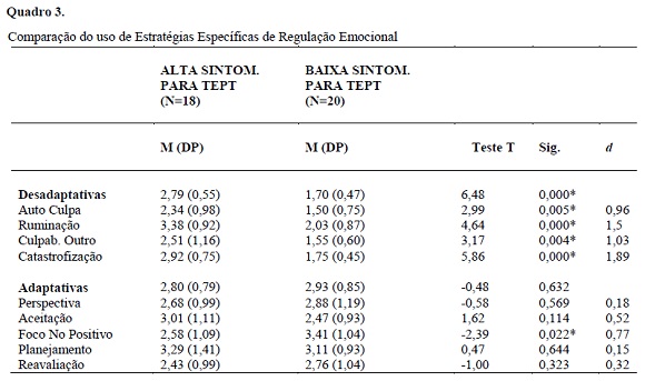 Após, foram analisadas as estratégias específicas de regulação emocional. Conforme pode ser visualizado no Quadro 3, foram observadas diferenças entre os grupos em relação às estratégias desadaptativas de regulação emocional, com o predomínio de maior frequência de uso dessas estratégias nos indivíduos com alta sintomatologia de TEPT. Todas essas diferenças são estatisticamente significativas e com tamanhos de efeito grandes (min = 0,96; máx = 1,89). Em relação ao uso de estratégias adaptativas, apenas foi observada uma diferença estatisticamente significativa no uso da estratégia de Focalização no Positivo, que predominou entre os indivíduos com baixa sintomatologia de TEPT. Em relação às demais estratégias adaptativas, não foi possível visualizar um padrão consistente.