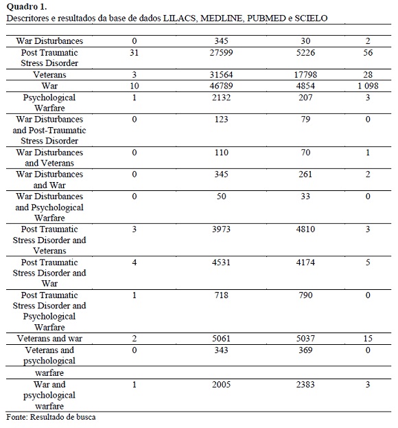 Os descritores foram determinados através da plataforma DeCS (Descritores em Ciências da Saúde) e da plataforma MeSH (Medical Subject Headings): Distúrbios de Guerra, veteranos, Guerra Psicológica, Distúrbios de Stress Pós-Traumáticos e guerra.
