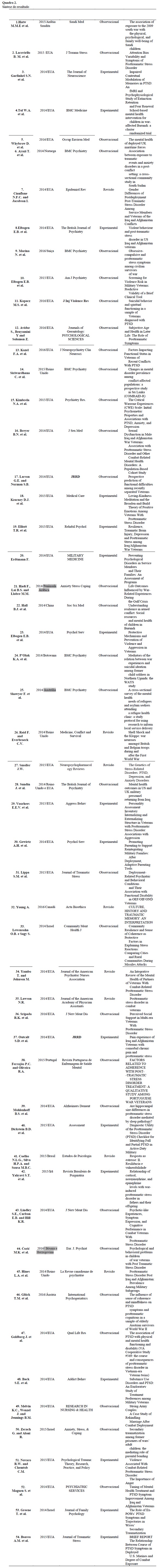Critérios de inclusão: Todo tipo de artigo, que abordasse o impacto de TEPT (Transtorno de Estresse Pós-Traumático) em militares e veteranos no seu cotidiano no âmbito da guerra; dados de todos os conflitos históricos voltados a guerra nos idiomas português, inglês e espanhol; com o recorte temporal entre os anos de 2014 a 2017.