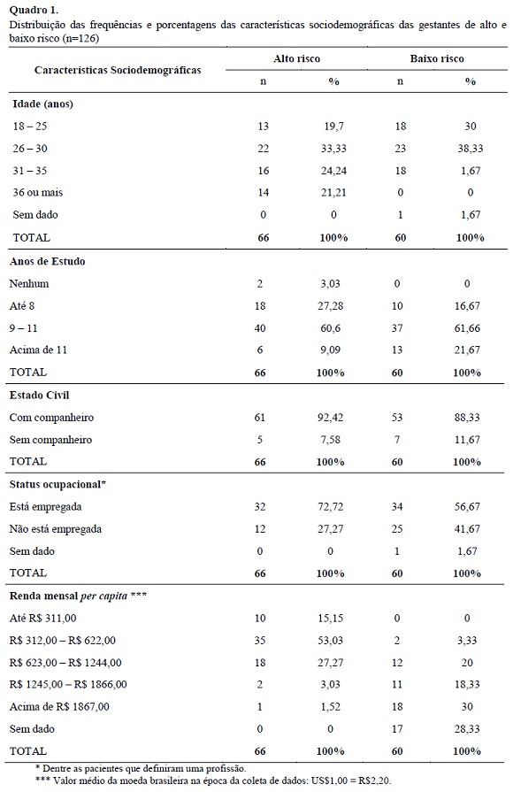Diante dos dados sociodemográficos, observa-se que as gestantes de alto risco possuem média de idade maior, menos anos de estudos e renda per capita menor comparada às gestantes de baixo risco. Pôde-se constatar uma diferença significativa da renda per capita entre os grupos de gestantes, sendo que a maioria das gestantes de alto risco recebia até R$622,00 por mês, o que na época da coleta de dados representava menos de um salário mínimo brasileiro. Tal fato pode influenciar a adesão da gestante de alto risco a seu tratamento, visto que esta deve despender mais recursos financeiros a fim de seguir uma dieta alimentar, visando o controle do nível glicêmico (Maganha, Vanni, Bernadini & Zugaib, 2003).