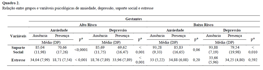 Ao analisar a relação do suporte social com as variáveis de presença de ansiedade e depressão, foi verificada relação estatisticamente significante no grupo de gestantes de alto risco tanto em relação à ansiedade como em relação à depressão. Neste grupo, as gestantes sem ansiedade obtiveram pontuação de suporte social superior às gestantes com ansiedade (U=239,00, p<0,001). Em relação à depressão, gestantes de alto risco sem depressão também obtiveram escore de suporte social superior às gestantes com depressão (U=193,00, p<0,001). Nas gestantes de baixo risco foi verificada relação estatística apenas em relação à depressão. As pacientes de baixo risco e sem depressão apresentaram um escore médio de suporte social maior do que as com depressão (U=198,50, p=0,010).