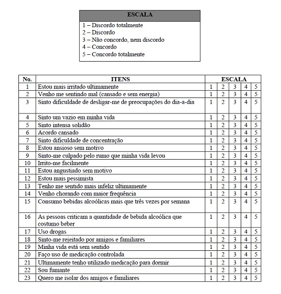 Após a elaboração dos itens por cada domínio realizou-se a análise de juízes (5 professores doutores) e análise semântica (20 sujeitos de homens e mulheres, com idade entre 20 e 49 anos). O resultado destas análises sugeriu um instrumento composto por 23 itens, subdivididos em dois domínios.