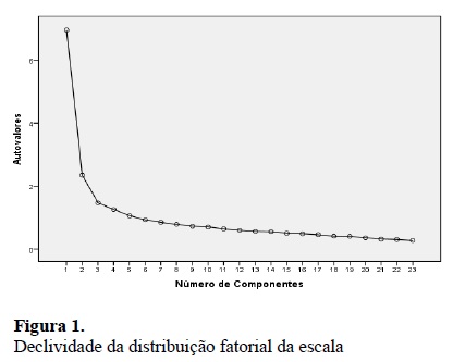 Os resultados das análises permitiram identificar a adequação da matriz de correlação: KMO = 0,89 e do Teste de Esfericidade de Bartlett, c2/gl = 274348/25 p < 0,001. Na distribuição gráfica dos valores próprios (critério de Cattell), no gráfico scree plot, permitiu identificar a existência de cinco fatores (ver Figura 1), os quais explicavam 56,94% da variância total.