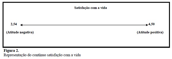Neste sentido, as atitudes e decisões individuais que afetam a saúde, representadas pelo estilo de vida são reflexos de condições associadas a “satisfação com a vida”, sendo possível estabelecer um contínuo unidimensional variando de 2,54 a 4,50, quando o Fator 2 atingir seus limites máximos (pólos extremos). Ou seja, o limite inferior (2,54), associado às atitudes negativas, acontecerá quando os escores de todas as VIs forem iguais a 1 e o limite superior (4,50) relacionado às atitudes positivas estará caracterizado quando os escores das VIs forem iguais a 5 (Figura 2).