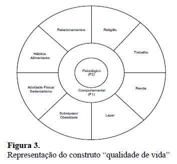 Assim, o modelo final do construto “qualidade de vida” é composto por dois vetores ortogonais que apresentam correlação positiva e exercem influência direta em toda maneira de ser ou agir do indivíduo. Estes vetores são representados, essencialmente, pelos fatores comportamental e psicológico. Importa ressaltar que o fator psicológico aparece como o “núcleo” do “bem-estar” e reforça a inter-relação entre as emoções, sentimentos e pensamentos com o comportamento e as atitudes, onde os fatores externos (modificáveis), apesar de intimamente relacionados às doenças crônicas não transmissíveis são consequências da relação do homem consigo (Figura 3).
