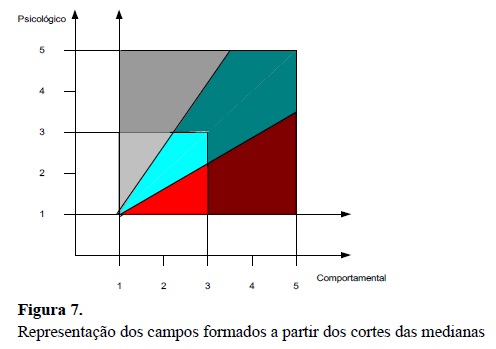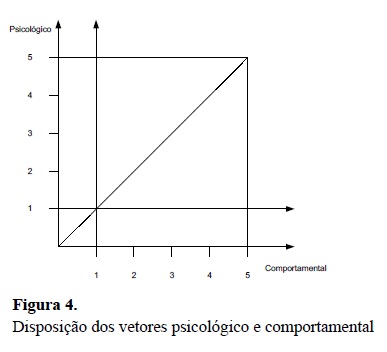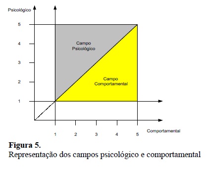 Como os itens dos fatores são avaliados em uma escala que varia de 1 a 5, as médias aritméticas dos mesmos, também variarão de 1 a 5. A bissetriz que divide ao meio o plano vetorial forma dois campos principais: a) Campo Psicológico e b) Campo Comportamental. A Figura 5 apresenta os campos formados pela bissetriz.
