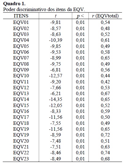 Comprovado então, as discriminações dos itens, efetuou-se uma análise de conteúdo a fim de verificar a representatividade comportamento-domínio da qualidade de vida (isto é, sistematicamente, busca-se verificar se a relação teórica do teste e as situações especificadas nos itens representam os aspectos esperados) (Pasquali, 2010). Ainda no quadro 1, pode-se observar que todos os itens se correlacionaram com a pontuação total da EQV o que revela não haver problema em relação ao conteúdo dos itens e o domínio do construto.