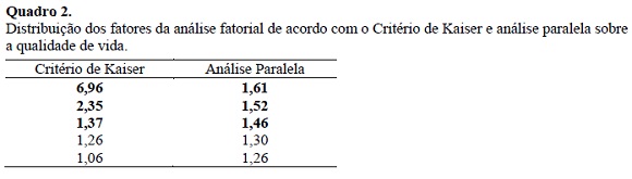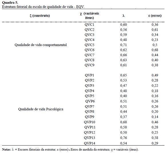 A partir dos resultados dos cálculos realizados acima pode-se destacar que a escala de qualidade de vida foi validada e apresentou indicadores estatísticos que garantiram a sua confiabilidade. Porém, nesta análise, a sua aleatoriedade não permite teorizar sobre as variáveis destacadas neste estudo, condição que optou-se na realização de uma análise fatorial confirmatória com objetivo de verificar a estrutura fatorial da EQV avaliada, previamente, na análise exploratória.