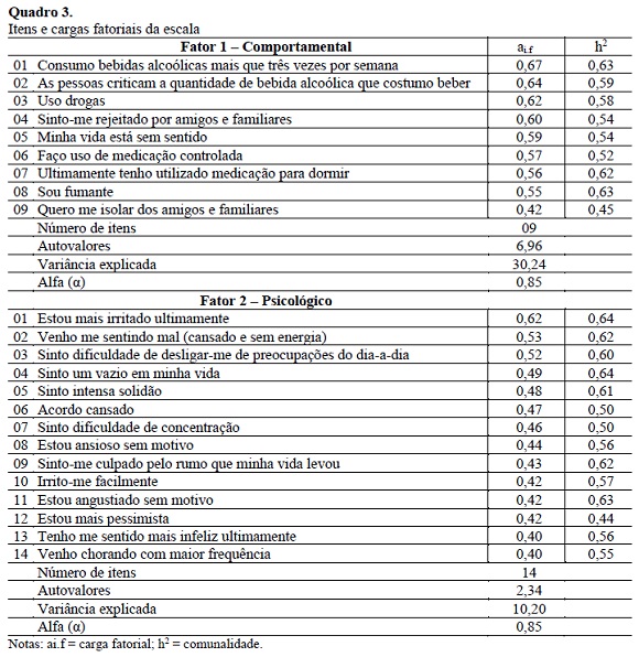 Desta forma, por meio do método PAF, com rotação oblíqua e cargas fatoriais iguais ou superiores a 0,40 foram extraídos dois fatores para a EQV. O Quadro 3 apresenta os fatores extraídos (Fator Comportamental e Fator Psicológico) os itens que os compõem e suas, respectivas, cargas fatoriais (aif) e os índices de consistência interna dos fatores (a de Cronbach) e a variância explicada para cada fator: