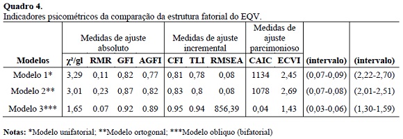 Para a EQV procurou-se testar a estrutura fatorial considerando os resultados observados no primeiro estudo com uma nova amostra de 214 sujeitos. A partir dos resultados geraram-se os modelos estruturais comparativos, por exemplo, unifatorial, ortogonal e oblíquo, este último é o que espera, hipoteticamente, ser comprovado. Os resultados revelaram, quando comparados aos demais modelos estabelecidos, que o modelo pretendido (isto é, o modelo obliquo-bifatorial) foi o que revelou indicadores psicométricos melhores do que os outros (Quadro 4).