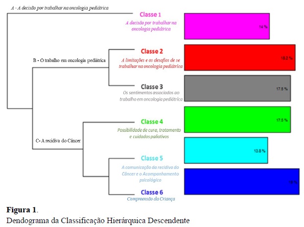 Essas seis classes se encontram divididas em três ramificações (A, B e C) do corpus total em análise. O subcorpus A, recebe o nome de sua única Classe 1 (“A decisão por trabalhar na oncologia pediátrica”), que se refere aos fatores que influenciaram os profissionais por trabalhar na área da oncologia pediátrica. O subcorpus B, “O trabalho em oncologia pediátrica”, que contém os discursos correspondentes à Classe 2 (“A limitações e os desafios de se trabalhar na oncologia pediátrica”), abordando os desafios e as dificuldades enfrentadas no cotidiano desses profissionais, bem como o reconhecimento dos próprios limites, e a Classe 3 (“Os sentimentos associados ao trabalho em oncologia pediátrica”), que aponta para os sentimentos mais presentes e o como lidam com eles. O Subcorpus C, “A recidiva do Câncer”, que é composto pela Classe 4 (“Possibilidade de cura, tratamento e cuidados paliativos”), que aponta sobre as possibilidades de cura, e mostram que quando o prognóstico é negativo, ainda há cuidado a ser feito, a Classe 5 (“A comunicação da recidiva do Câncer e o Acompanhamento psicológico”), indicando que o acompanhamento psicológico inicia durante e depois do processo de comunicação do diagnóstico da recidiva, ou seja, desde a entrada do paciente no hospital, e a Classe 6 (“Compreensão da Criança”) apontando que a criança é capaz de compreender a doença, o tratamento e o processo de morte, a seguir descritas (ver Figura 1).