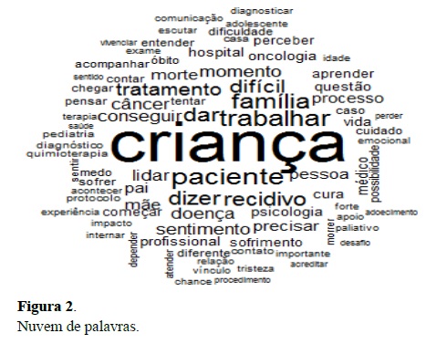 Ao final, foi possível analisar a nuvem de palavras obtida por meio dos relatos dos próprios participantes, verificando-se que as palavras mais evocadas foram: “Criança”, “Paciente”, “Trabalhar”, “Família”, “Câncer”, “Dizer”, “Recidivo”, “Tratamento”, “Difícil”, “Lidar” e “Conseguir”. Observa-se que, para os participantes, a recidiva do câncer é uma experiência extremamente difícil não só para a criança e para a família, mas também para o profissional que é o principal responsável pelo cuidado, devendo ser esse o foco principal do trabalho (ver Figura 2).