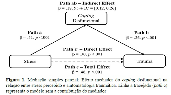 Para análise dos efeitos diretos e indiretos das estratégias disfuncionais (mediador) na relação entre stress percebido (VI) e trauma (VD), já verificada anteriormente, foi realizada uma análise de mediação simples. Os resultados estandardizados (Figura 1) revelaram uma mediação simples parcial (F[1,501] = 151,05 p < ,001 R² = ,232).