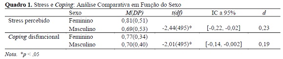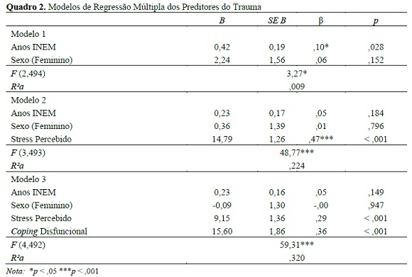 O trauma, stress percebido e coping disfuncional correlacionaram-se entre si positivamente e quanto mais elevados eram os níveis de trauma, mais elevados eram os de stress percebido (r[503]=,48 p < ,001) e de utilização de estratégias disfuncionais (r[503]=,51 p < ,001). As estratégias disfuncionais também se correlacionaram positivamente com o stress (r[503]=,51 p < ,001). Estes dados são concordantes com vários estudos (Arble et al., 2018; Fonseca et al., 2019a; Fonseca et al., 2019b; Jamal et al., 2017; Skeffington et al., 2017).