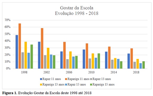 Na Figura 1 apresenta-se a análise da questão relacionada com o Gosto pela Escola ao longo dos estudos HBSC realizados em Portugal, organizadas pelos três grupos de idade e separadas por género. Verifica-se um decréscimo em relação ao gosto pela escola consistente ao longo dos anos, e à medida que os estudantes vão ficando mais velhos, e as raparigas referem gostar mais da escola do que os rapazes.