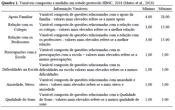 Este trabalho encontra-se integrado no Health Behaviour in School aged Children/HBSC (Inchley et al., 2016; Matos et al., 2015; 2018), que é um inquérito realizado de 4 em 4 anos em 48 países, em colaboração com a Organização Mundial de Saúde, seguindo um protocolo internacional (Roberts et al., 2009).