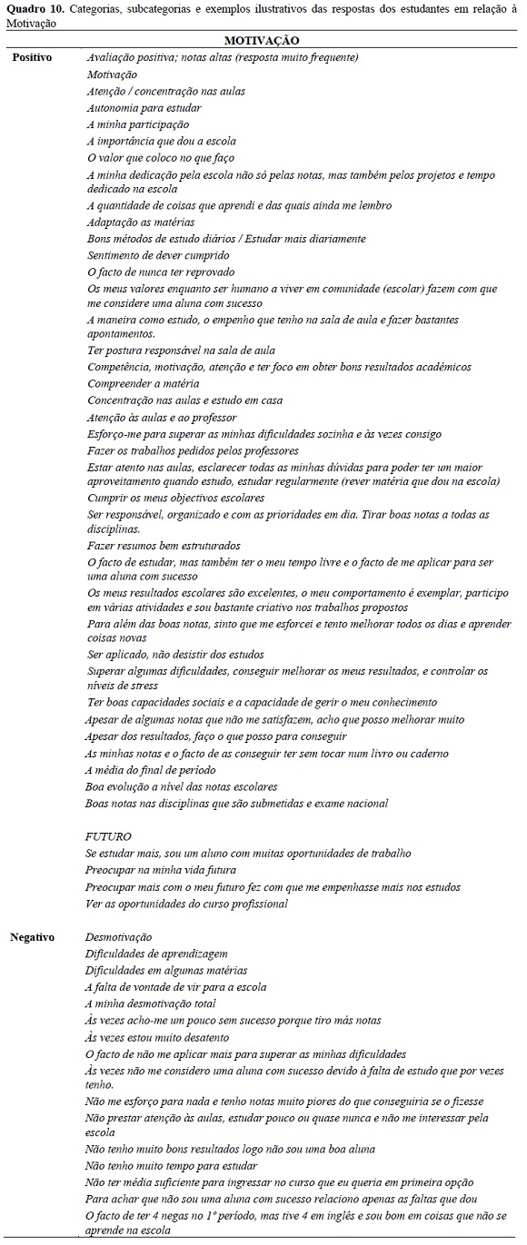 Ao nível da Motivação, revelam que tem interesse e gosto por aprender, revelam algumas estratégias que utilizam para se motivar “Para além das boas notas, sinto que me esforcei e tento melhorar todos os dias e aprender coisas novas”; “Sentimento de dever cumprido” e perseguir os objetivos de sucesso escolar, tais como, “Bons métodos de estudo diários e Estudar mais diariamente”. Refletem que o sucesso e manutenção da motivação são complexos e envolvem a articulação e conjugação de diversas variáveis “Competência, motivação, atenção e ter foco em obter bons resultados académicos”; “O facto de estudar, mas também ter o meu tempo livre”. Como aspetos menos positivos relacionados com a motivação referem dificuldades de aprendizagem e desmotivação em relação à escola “A falta de vontade de vir para a escola” e falta de empenho “O facto de não me aplicar mais para superar as minhas dificuldades”, e falta de expectativa face ao futuro “Não ter média suficiente para ingressar no curso que eu queria em primeira opção”.