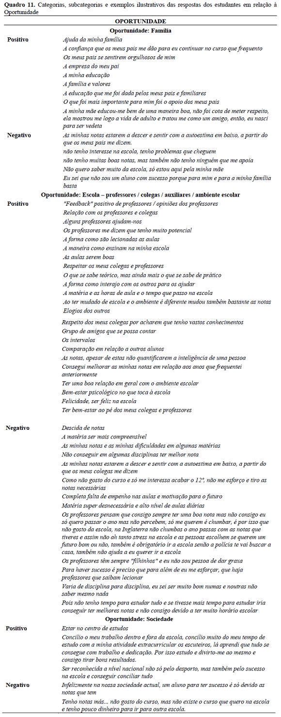 Ao nível da oportunidade, os estudantes referem aspetos relacionados com a família, com a escola e com a sociedade em geral. A família surge como um fator de apoio ao sucesso escolar “A confiança que os meus pais me dão para eu continuar no curso que frequento”, mas também é referida como um fator de risco “As minhas notas estarem a descer e sentir com a autoestima em baixo, a partir do que os meus pais me dizem”.