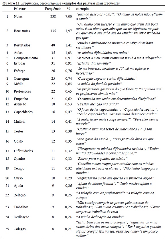 Através da utilização do programa MAXQDA, a nuvem de palavras resultante inclui as 25 palavras com significado mais frequentes, no quadro 12 encontra-se a frequência das palavras utilizadas. As notas de avaliação são o fator que mais surge associado ao sucesso escolar, seguida pelo funcionamento das aulas, comportamentos e esforço e os professores.
