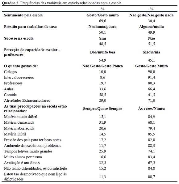 O gosto pela escola está associado ao género, idade, à relação com os professores, com as preocupações com a escola, com a ansiedade/stress e perceção de controlo e com a qualidade do sono, a pressão com os trabalhos de casa está relacionada com género, idade, relação com os colegas, preocupações na escola e ansiedade/stress/falta de controlo. Por seu lado a perceção de sucesso dos alunos está relacionada com idade, relação com os professores, preocupações na escola e ansiedade/stress/falta de controlo.