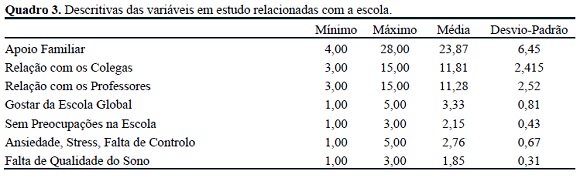 Os resultados indicados no quadro 3 reportam valores elevados relativos ao apoio familiar, relação com colegas e professores. A Ansiedade, Stress, Falta de Controlo e a qualidade do sono são os fatores que revelam valores menos positivos.