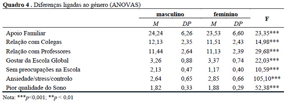 O estudo das diferenças de género em relação às variáveis relacionadas com o ecossistema escolar, indicam diferenças estatisticamente significativa entre rapazes e raparigas para todas as dimensões. As raparigas revelam valores menos positivos em relação ao apoio familiar, à relação com os professores e colegas, maiores preocupações na escola, mais ansiedade, stress e falta de controlo e menor qualidade de sono. Os rapazes referem um menor gosto global pela escola.