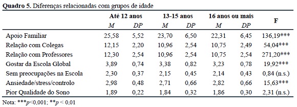 O estudo das diferenças de idade em relação às variáveis relacionadas com o ecossistema escolar, indicam diferenças estatisticamente significativa entre os estudantes segundo a sua idade para muitas das dimensões. São os estudantes mais novos (12 anos ou menos) que revelam valores mais positivos em relação ao apoio familiar, à relação com os professores e colegas e maior gosto global pela escola.