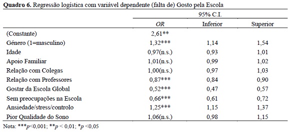 No estudo dos fatores relacionados com o gosto pela escola verificamos que a falta de gosto pela escola é melhor explicada pelo género, relação com os professores, gosto global com a escola, preocupações na escola e ansiedade/stress/falta de controlo. O ser rapariga, o ser mais velhos, a má relação com os professores, o não gostar das diversas componentes da escola, as preocupações e o ter ansiedade/ stress/ falta de controlo explicam melhor a falta de gosto pela escola. O modelo encontrado explica 25% da variância.