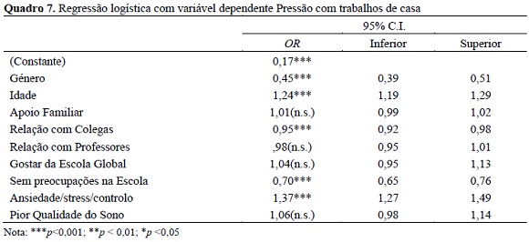 No estudo dos fatores relacionados com a pressão com os trabalhos de casa verificamos que esta é melhor explicada pelo género, idade, relação com os colegas, preocupações na escola e ansiedade/stress/falta de controlo. O ser rapariga, o ser mais velho, a má relação com os colegas, as preocupações e o ter ansiedade/ stress /falta de controlo explicam melhor a pressão com os trabalhos de casa. O modelo encontrado explica 18% da variância.