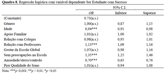 No estudo dos fatores relacionados com a perceção de ser um estudante de sucesso verificamos que a perceção de sucesso é melhor explicada pela idade, relação com os professores, preocupações na escola e ansiedade/stress/falta de controlo. O ser mais novo, a boa relação com os professores, ter menos preocupações, e ter menos ansiedade/ stress / falta de controlo explicam melhor a perceção de ser um estudante de sucesso. O modelo encontrado explica 14% da variância.