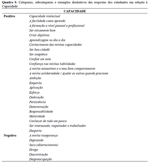 Numa segunda parte do estudo, os dados qualitativos resultantes da pergunta aberta relacionada com o que os alunos consideram importante para serem ou não alunos de sucesso, foram alvo de análise de conteúdo, os resultados foram organizados em categorias e subcategorias e indicados exemplos ilustrativos das respostas dos estudantes.