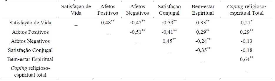 Observou-se também que o Coping religioso-espiritual Total e Bem-Estar Espiritual Total se correlacionaram positivamente com o Bem-estar Subjetivo, representado pela Satisfação de Vida e Afetos Positivos. É importante destacar que neste estudo a dimensão Bem-estar Subjetivo foi avaliado por duas escalas diferentes (Escala de Satisfação de Vida e Escala de Afetos Positivos e Negativos), que fazem referência aos seus fatores constituintes. Os resultados obtidos das correlações entre esses fatores evidenciaram que a amostra apresenta um elevado Bem-estar Subjetivo (Albuquerque & Tróccoli, 2004; Layous & Zanon, 2014; Scorsolini-Comin et al., 2016). Assim, quanto mais a pessoa se relaciona com Deus, experienciando o bem-estar de encontrar um propósito para a vida e utiliza da R/E para lidar com fatores estressantes maiores serão seu bem-estar individual e as emoções positivas no casamento (Albuquerque & Tróccoli, 2004; Panzini & Bandeira, 2005; Scorsolini-Comin et al., 2012).