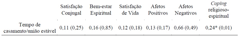 Dessa maneira, observamos que embora a variável tempo de casamento/união estável apresente correlação significativa apenas com o Coping religioso-espiritual Total, ainda assim trata-se de uma associação fraca (Zou et al., 2003), com pouca capacidade de explicação do fenômeno. Essa baixa magnitude indica que esse esse achado ser analisado com parcimônia.
